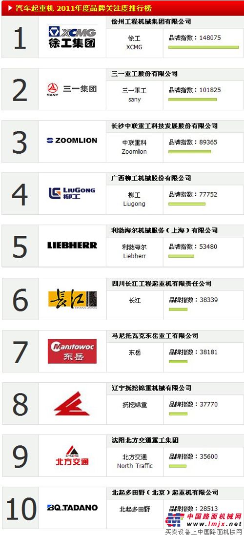 2012年3月,中國路面機械網(wǎng)隆重推出“2011中國汽車起重機品牌關(guān)注度TOP10排行榜”。不過,與以往中國工程機械行業(yè)各種排行榜按照企業(yè)年銷售額、營業(yè)收入、營業(yè)利潤等硬性指標排出不同的是,此次推出的“2011中國汽車起重機品牌關(guān)注度TOP10排行榜”是中國路面機械網(wǎng)依據(jù)網(wǎng)絡(luò)用戶對瀝青攪拌設(shè)備品牌或產(chǎn)品的瀏覽次數(shù)及在線詢價的次數(shù)所生成的品牌關(guān)注指數(shù)。 2011中國汽車起重機品牌關(guān)注度TOP10排行榜 |